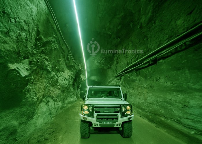 Our green LED strip model: 15W-L10-230V-G to illuminate a typical mining tunnel with dimensions 5m wide per 5m height with capacity for a single truck, we will only need to install one green led strip light at 4m height on one side of the tunnel to achieve an illuminance or luminous efficiency of 50 to 60 lux as you can see at image.